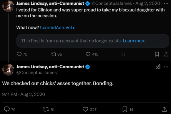James Lindsey, an atheist Zionist and Clinton voter, bragging about taking his bisexual daughter to an event to “check out chick’s asses together”